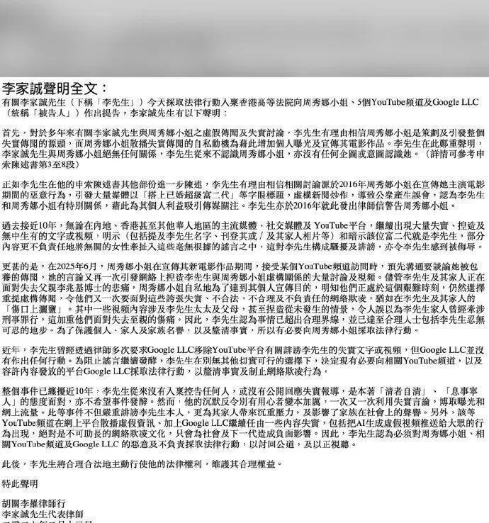 李家诚发了个声明。他说那些关于他和周秀娜的传闻,都是假的。他认为这些假消息的源头就是周秀娜本人。动机呢,是为了给她自己的电影增加曝光。这话说得挺重的。他接着强调,自己根本不认识周秀娜。过去不认识,现在也没打算认识。声明里用了“绝无任何关系”这种词。算是把话说死了。他还把几个自媒体账号给告了。理由是诽谤和骚扰。他希望借此刹住网络欺凌这股风。事情就是这么个事情。一份个人名义的声明,把话摊开在台面上。剩下的,就得看后续了。